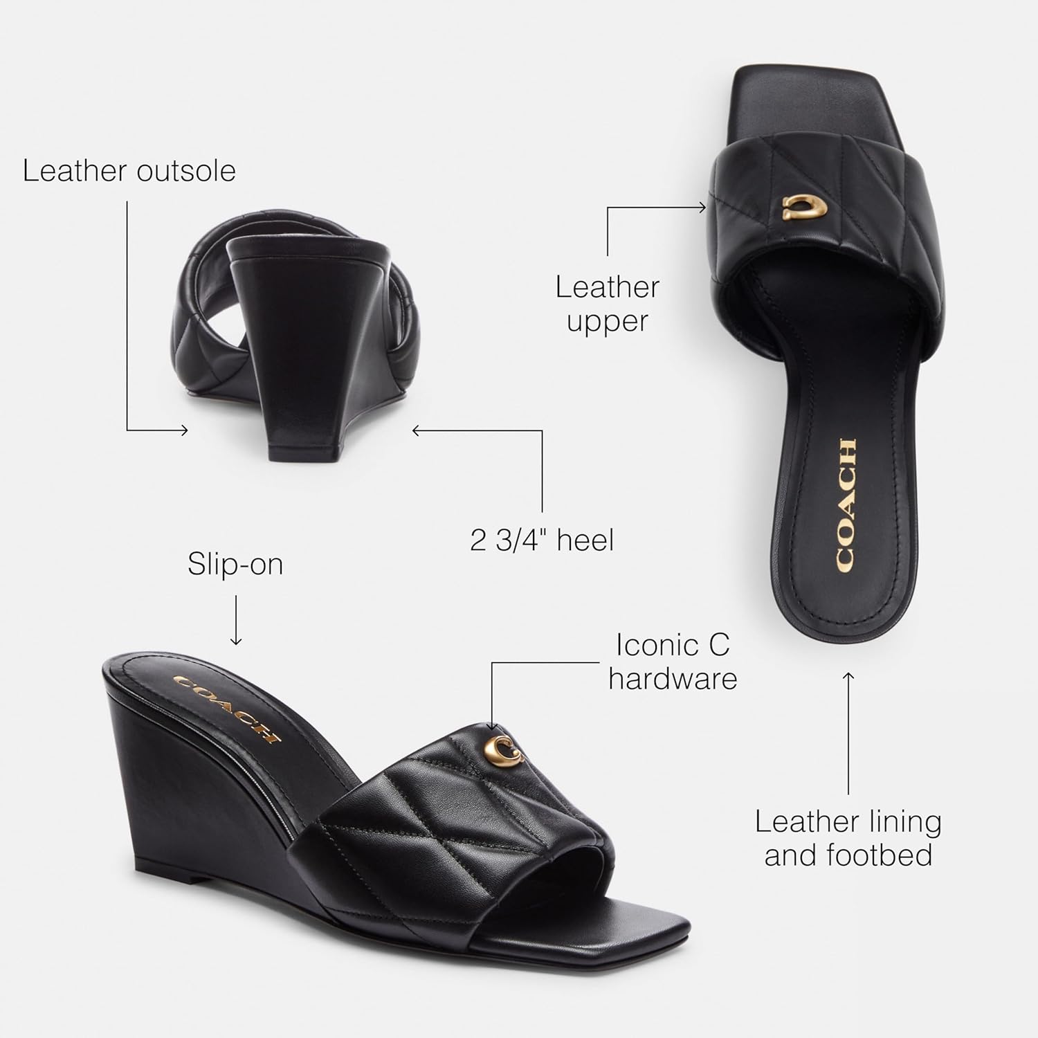 Leather Upper: These versatile coach sandal wedges have a square toe silhouette and a smooth leather upper