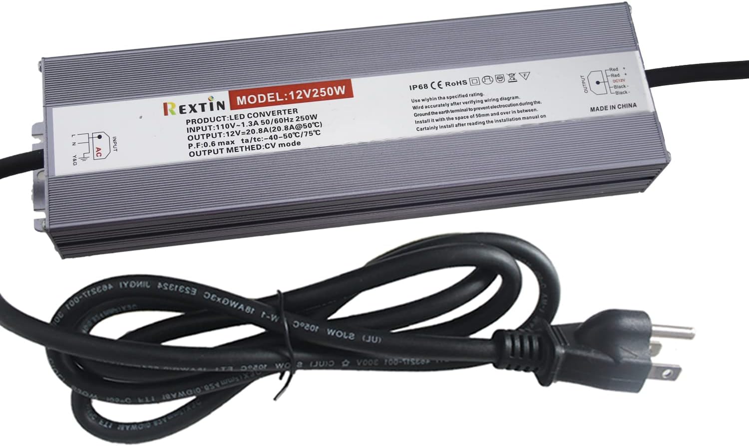 Input: 85-265V AC 50/60Hz, Output: 12V 21A Power:250W Shell Material: Aluminum Alloy IP67 Waterproof