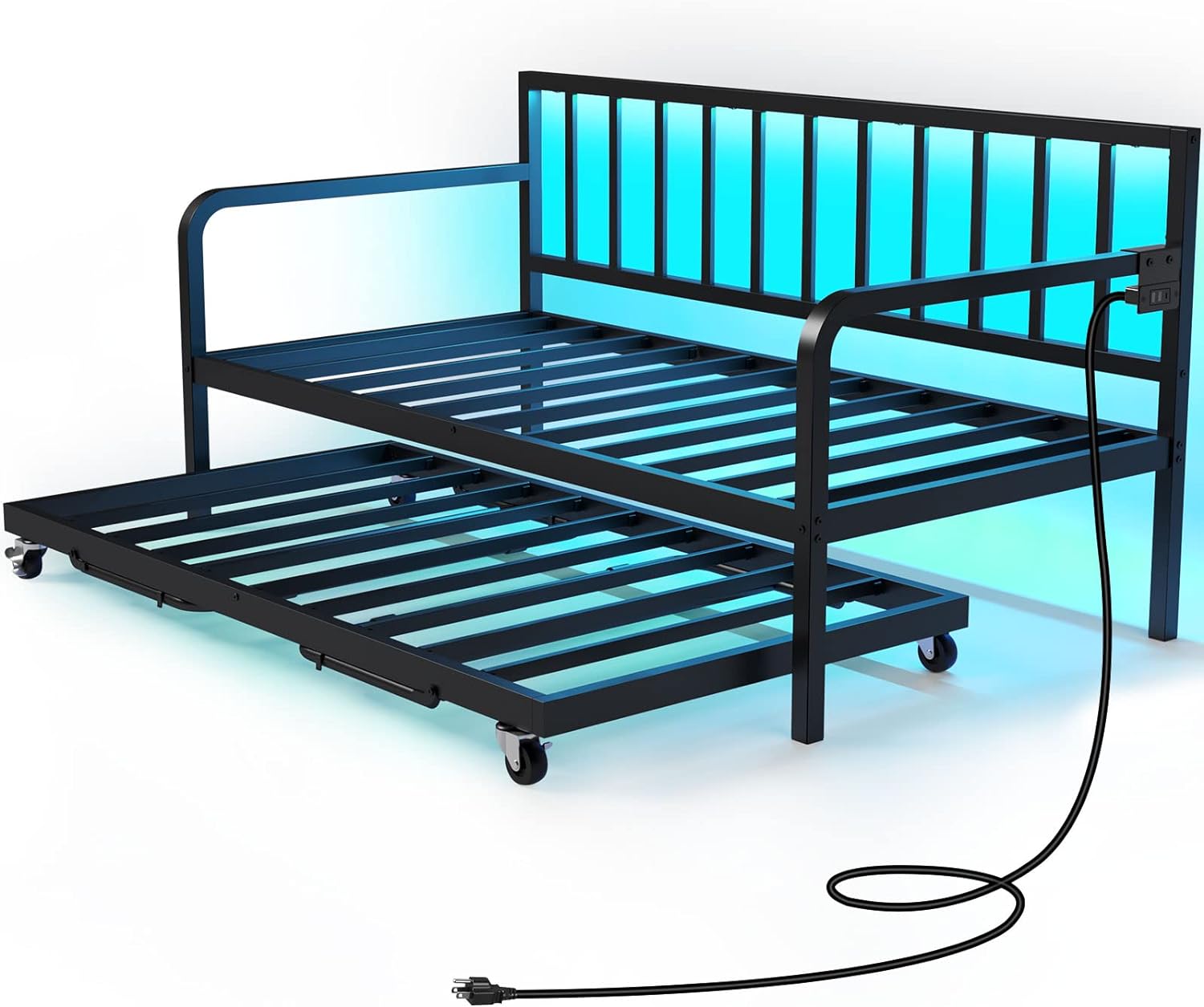 Rolanstar Daybed with Charging Station and LED Lights, Height Adjustable Twin Daybed with Trundle, Metal Sofa Bed Frame with Steel Slat Support for Living Room, Bedroom and Guest Room, Black