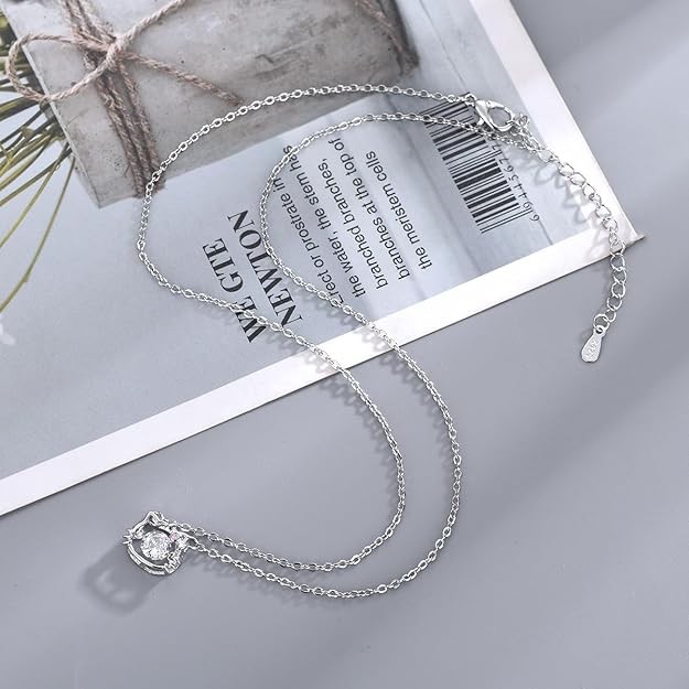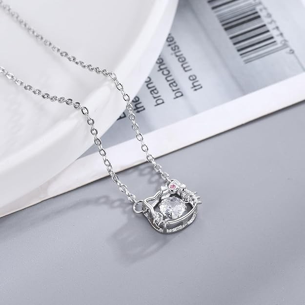 Women Cute Cat Necklace, Silver Cute Natural Diamond Cat Pendant Necklace- Pink Kitty Cat Necklace for Women Gifts